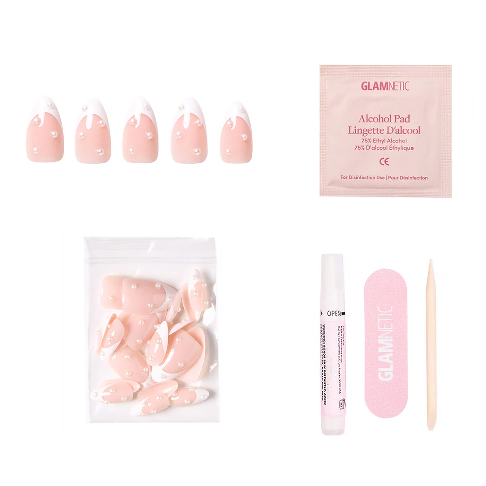 Add a touch of timeless elegance with French Pearl. These short almond nails feature classic white French tips enhanced by delicate pearl gems, creating a look that’s effortlessly chic. Ideal for bridal events, formal gatherings, or an elevated everyday style, the semi-transparent glossy finish brings a polished sophistication that pairs with any outfit.