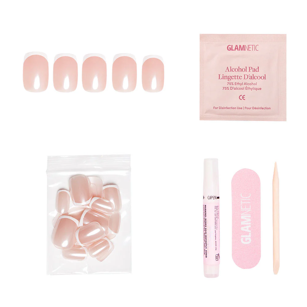 Ready to fall in love with the La Perle Nail Set? This trendy style features a twist on a classic French tip design and a glazed finish that sparkles like an ocean pearl. Plus, Glamnetic's short squoval shape instantly elevates your look, while still looking seamlessly like your own fingernails!